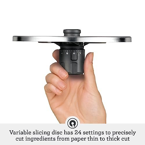 Variable Slicing Disc: The adjustable slicing disc offers 24 settings—from paper-thin slices to thick cuts—so I can customize my ingredients to suit any dish.